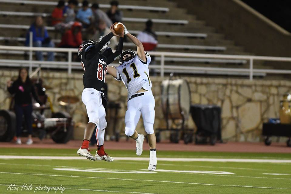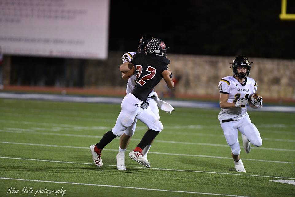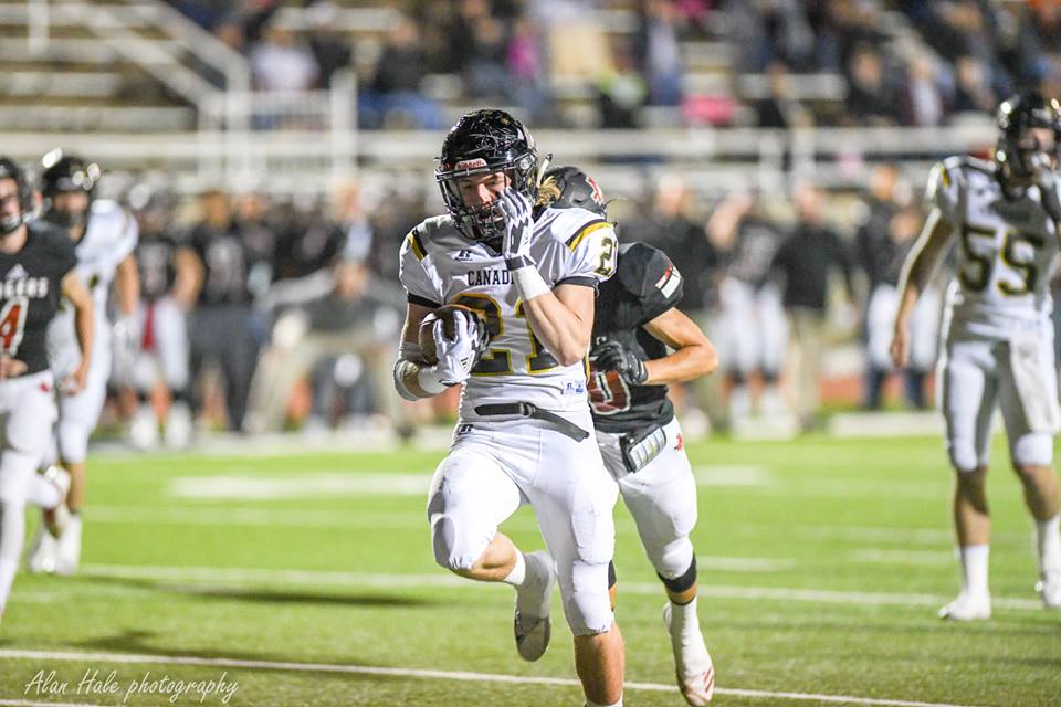 The second quarter started with Canadian adding a defensive score to the mix with DL Rhett Pennington grabbing a 12 yard Pick Six. As the NASCAR paced offense continued to punish the Tigers with tempo, it seemed that each snap of the ball was faster with each down. The relentless pace gave the Anson defense little or no time to prepare for the inevitable result - another scoring drive. The jets on Hayze Hufstedler had not cooled either as he showed track meet speed down the Canadian sideline for a 61 yard TD. WR Trent Evans also added another TD to his season total when Cavalier found one of his favorite wide receivers wide open in the end zone.