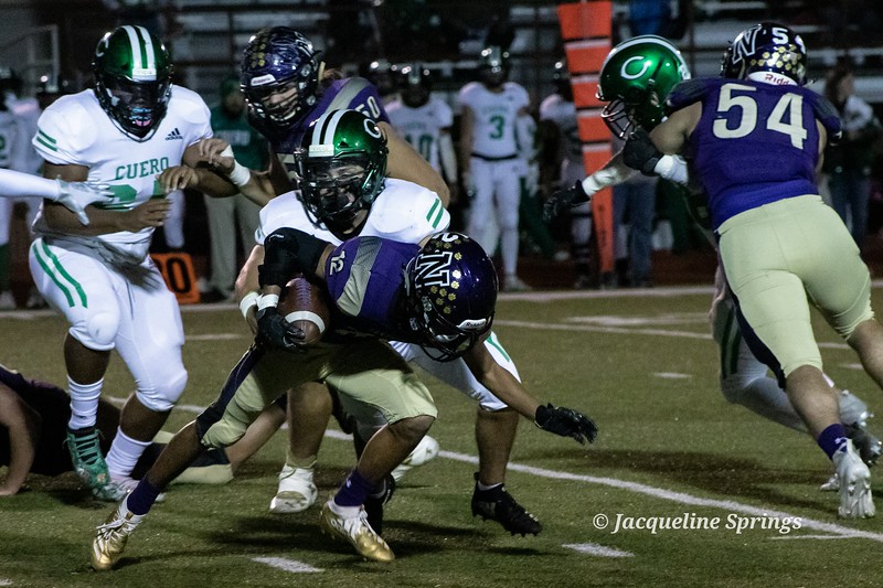 Geronimo Navarro and Cuero engaged in a tough back and forth battle with Navarro winning 22 to 14. Navarro drove the ball 99 yards in 85 seconds before half after stopping Cuero on downs at the 1 yard line to tie the game at 8. Navarro remains unbeaten with a 9-0 record. Navarro closes out the regular season on the road at Bandera for the outright Distict Title! LSG contributor Jacqueline Springs was on hand to capture the action.