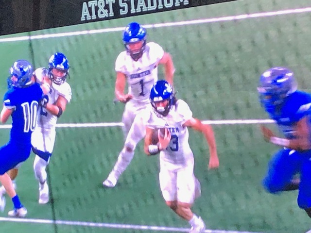 Gunter took the opening kickoff and showed off their running game. They went 70 yards on 7 plays and Clayton Reed ran it in from 14 yards out. Gunter led 7-0 early on. After stopping the Brahmas, Gunter took it down the field again and scored on a short run by Hudson Graham to take a 14-0 lead. Omaha Paul Pewitt used a passing game to move into position. Quarterback Cross Holder ran it over from 1 yard out. The 2 point conversion was good and Gunters lead was now 14-8. Gunter ball in Pewitt territory as the quarter ends.