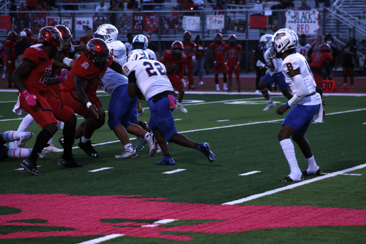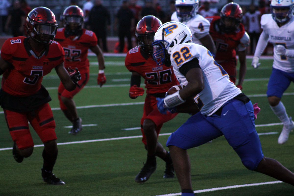 Behind a potent ground game and opportunistic defense, the Mustangs cruised to a 45-12 drubbing of the Panthers. Running back Quinten Joyner gashed the Panthers’ defense for over 200 yards and two touchdowns, and running back Che Nwabuko caught a touchdown pass. Receiver Isaiah Crosby also caught two touchdown passes, and quarterback Jayson Zardavets scored a touchdown on the ground. Defensively, the Mustangs held the Panthers under 300 yards of total offense and forced three turnovers.