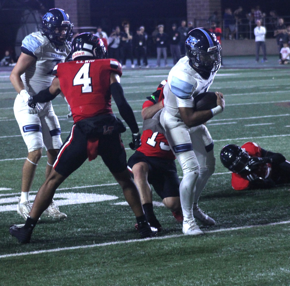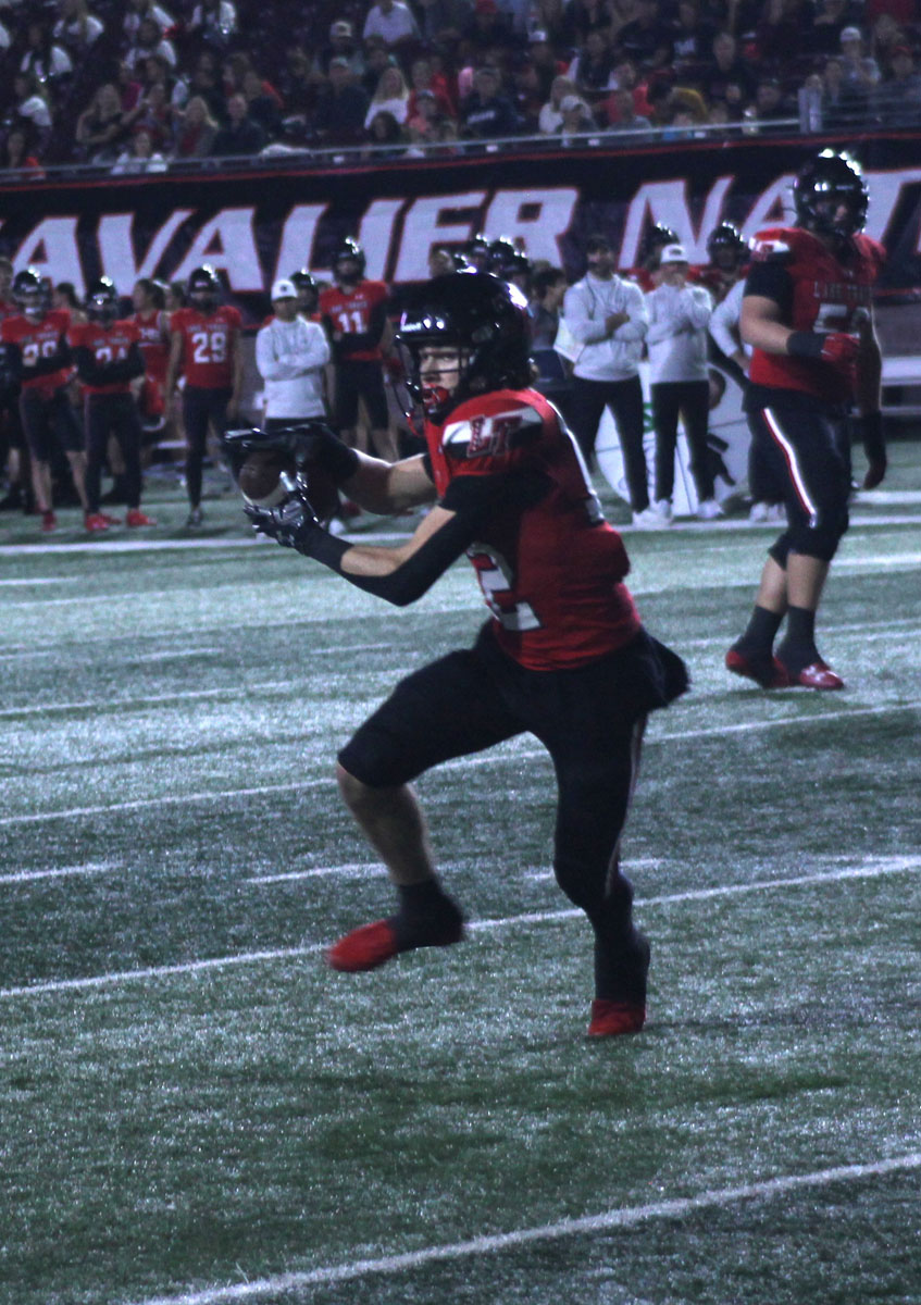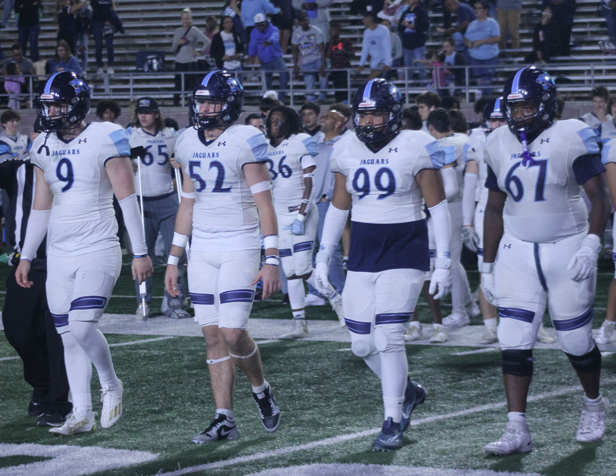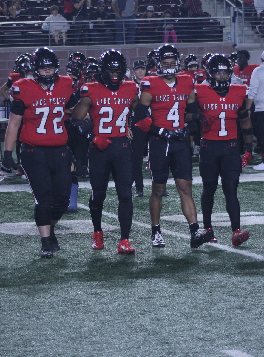 From the start, the Cavaliers left no doubt that they were not the underdogs. On the opening kickoff, defensive back Josiah Estes returned the ball 78 yards for a touchdown. Following the touchdown, the Cavaliers’ defense took over. All three of the Jaguars’ first-quarter drives ended with interceptions by defensive backs Keiondre Lewis and Cam’Ren-Chance Brooks and linebacker Easton Aird. Nico Hamilton capitalized on the first two interceptions with touchdown runs of three and 12 yards, and receiver Kadyn Leon caught a 10-yard touchdown pass to give Lake Travis a 27-0 lead.